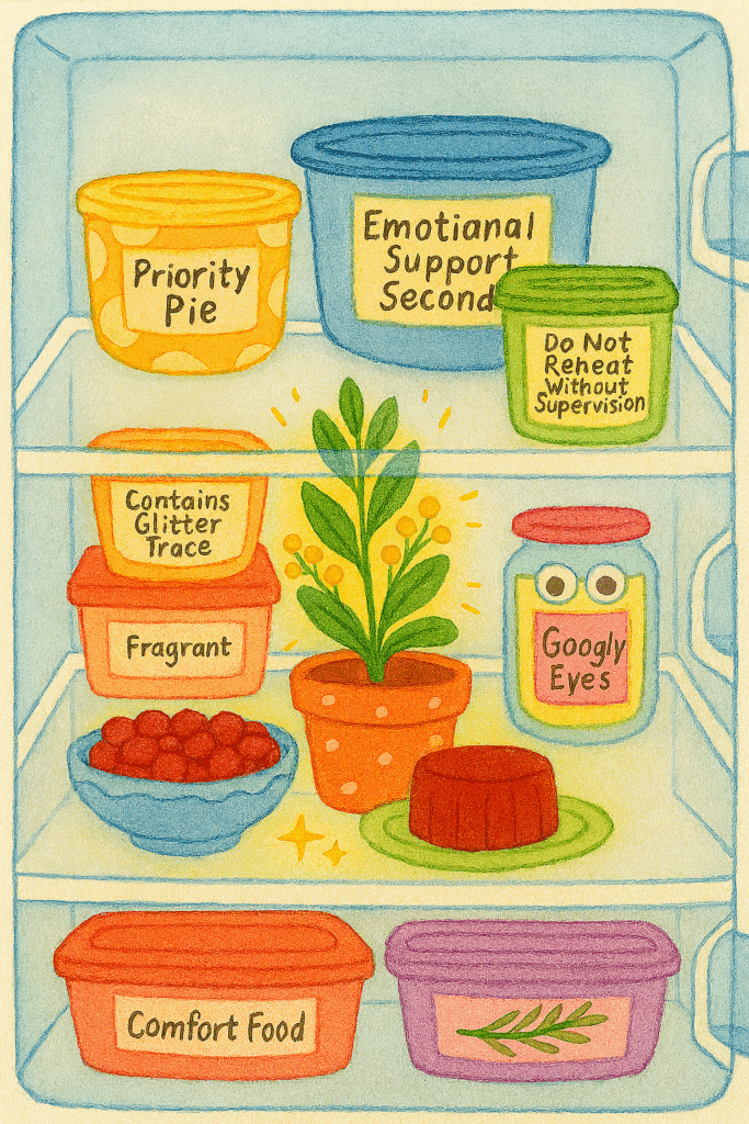 Snugbitty had labeled every container with color-coded tags: “Priority Pie,” “Emotional Support Seconds,” and “Do Not Reheat Without Supervision.”
