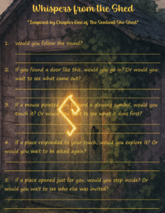 Inspired by the quiet magic of the She Shed, this journaling page was created as a little gift for those who’ve walked the path with us. It’s designed to be printed on card stock, with plenty of space to write your own whispers, reflections, or mouse-led discoveries.