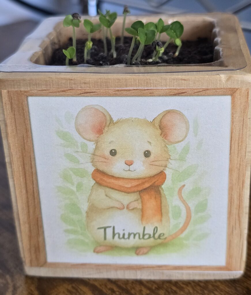 Her title wasn’t just given—it was earned. After planting her first bloom in a wooden planter gifted by a friend, Thimble was officially recognized as the She Shed’s Plant Guardian. Her image now sits proudly on the planter, marking her place in Pinky’s World.